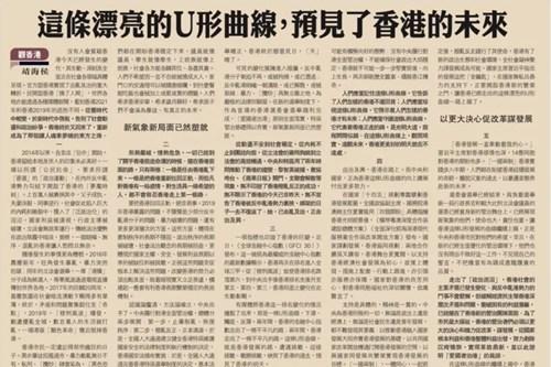 人们应当记住这条U形曲线,它告诉了人们怎样的香港不堪回首;人们应当珍视这条U形曲线,它启示着人们怎样的香港才有未来;人们应当守护这条U形曲线,它代表着香港正走的路,是光明大道,前程开阔似锦。在这条U形曲线上,观照现实、远观未来,香港更美好的明天就在不远处。