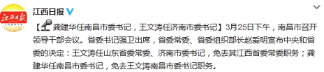 中新网3月25日电 据江西日报官方微博消息,3月25日下午,南昌市召开领导干部会议。省委书记强卫出席,省委常委、省委组织部长赵爱明宣布中央和省委的决定:王文涛任山东省委常委、济南市委书记,免去其江西省委常委职务;龚建华任南昌市委书记,免去王文涛南昌市委书记职务。