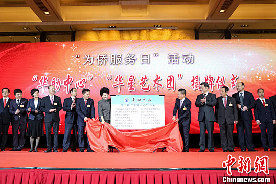 9月28日,国侨办主任裘援平在国务院侨办举行的“为侨服务日”系列活动上,为新一批“华助中心”及“华星艺术团”揭牌。中新社记者 熊然 摄