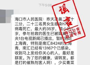 中新网3月30日电 近日,一条“海口市人民医院有23名男女生感染h7n9病毒死亡”的信息在海口微信群中传播。海南省海口市公安局官方微博30日辟谣称,该信息系陈某毫在未经核实的情况下,对网传信息进行修改后发送到微信群中,已对其作出行政拘留十日的处罚决定。
