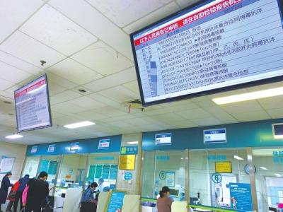 在完成其他项目检查后,张女士回到检验科窗口前等待检查结果。在等候过程中,陪同张女士前往医院的朋友发现,“检验科窗口上挂了几个显示屏,上面滚动播放着检查结果是否已出来。”
