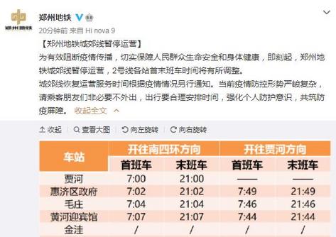 中新网5月6日电 据郑州市轨道交通有限公司运营分公司官方微博6日消息,为有效阻断疫情传播,切实保障人民群众生命安全和身体健康,即刻起,郑州地铁城郊线暂停运营,2号线各站首末班车时间将有所调整。