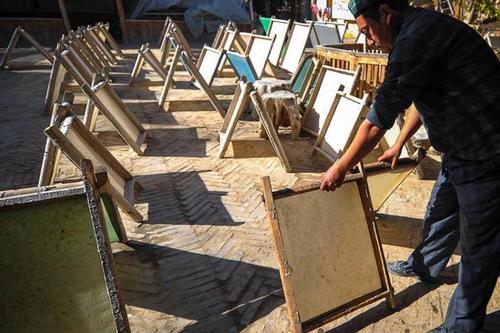 “我们以前都是自己在家弄的,做出来的纸质量没有那么好,后来政府过来帮忙把院子改造了一下,还有专业技术人员过来指导,现在造出来的纸好多了。”布再乃普·斯玛依说,“现在每天能做50多张,有很多旅游、写书法画画的人过来买。”