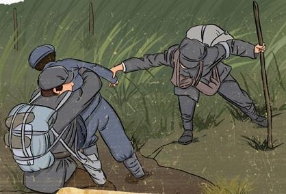 在红军穿越松潘草地时,许多战士因为恶劣的气候失去了生命。但是在草地上,没有任何办法来安葬战士们,当时红1团的团长、营长和侦查参谋的回忆录上都写着,过草地每个人会有一根探路的树枝,战士们牺牲后,就把他用过的树枝插在他牺牲的地方。那一路蜿蜿蜒蜒的树枝,被称作“拐棍碑”,每一根树枝下面都是一个牺牲的同志。作为长征史上最艰苦的象征,它们永远铭刻在中国革命的史册上。