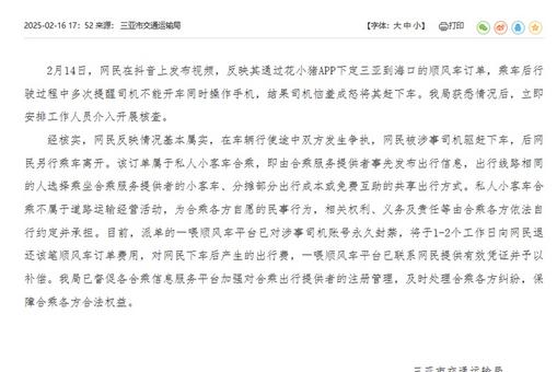 中新网2月17日电 据三亚市交通运输局网站消息,2月16日,三亚市交通运输局发布情况通报称,2月14日,网民在抖音上发布视频,反映其通过花小猪APP下定三亚到海口的顺风车订单,乘车后行驶过程中多次提醒司机不能开车同时操作手机,结果司机恼羞成怒将其赶下车。三亚市交通运输局获悉情况后,立即安排工作人员介入开展核查。