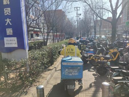 中午12点半,位于中关村东路的世纪科贸大厦正是繁忙的时候。大厦所在的院子有很多餐饮门店,拎着打包袋的骑手频频从店内走出,来到院子的西门外。