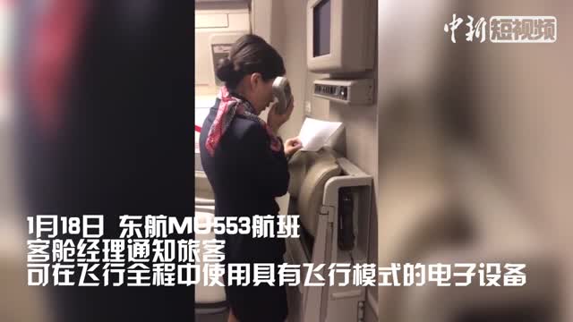登机结束后,客舱经理蔡正英通过机上广播通知,该航班旅客可在飞行全程中使用具有飞行模式的移动电话(智能手机)和规定尺寸内的便携式电脑或平板电脑、电子书等小型PED设备,但需将电子设备设置为飞行模式。