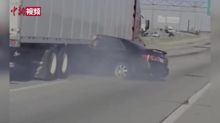小轿车被卡入货车底部拖行 司机仍淡定挥手