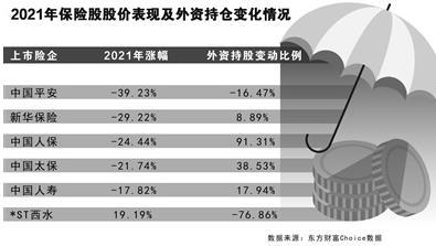 2021年,保险板块(申万二级)收获近10年来最大年度跌幅,其跌幅仅次于教育板块,位列A股各行业跌幅榜第二位。不过,在保险股大跌之际,外资不仅没有对保险股全线减持,还逆市加仓了部分保险股。