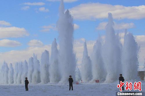 黑龙江即将开河 冰凌爆破激起百米“冰瀑”
