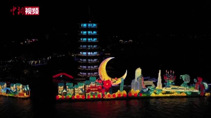 中新网昆山9月16日电 (记者 钟升)来自昆山的娄江水与台湾的日月潭水一道注入并蒂莲造型的容器。一盏盏江南与台湾特色的花灯随之点亮,彼此的光芒融成一片。16日晚,以“花开并蒂灯映两岸”为主题的2021海峡两岸(昆山)中秋灯会在江苏昆山启幕。