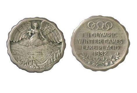 奖牌外形类似于一个盛开的向日葵。奖牌正面的上半部分,一位长着翅膀的女神在云层之上,右手拿着一顶桂冠。女神脚下是以阿第伦达克山脉为背景的冬季运动场、滑雪跳台和普莱西德湖美景。 奖牌边缘的弧线形状象征着古代的石柱。奖牌背面上半部分是奥运五环,下半部分是月桂树枝。