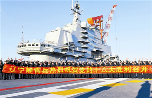 中新网11月8日电 据中国军网海军频道报道,11月7日,我军首艘航母、海军“辽宁舰”上千名官兵展开鲜红的彩色条幅,高声欢呼,欢庆党的十八大胜利召开。