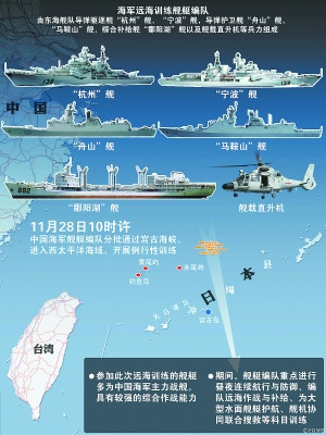 海军远海训练舰艇编队由东海舰队导弹驱逐舰“杭州”舰、“宁波”舰,导弹护卫舰“舟山”舰、“马鞍山”舰,综合补给舰“鄱阳湖”舰以及舰载直升机等兵力组成。