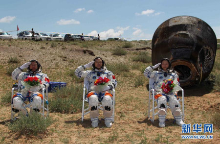 6月29日,航天员景海鹏、刘旺、刘洋出舱后敬礼致意。新华社记者王建民摄