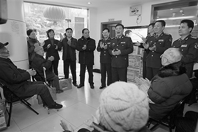 1月21日,上海某预备役高炮师官兵带着深情厚谊,连续第8年走访慰问驻地老战士、百岁老人和困难群众。图为师文艺骨干在吴淞敬老院向孤寡老人即兴演唱歌曲,表达美好祝福。(葛传宝)