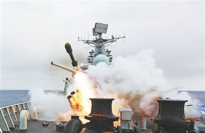 3月30日,海军某驱逐舰支队组织驱护舰编队开展海上对抗演练,一艘驱逐舰发射舰艏火箭深弹,重创“敌”潜艇。(李章龙摄)