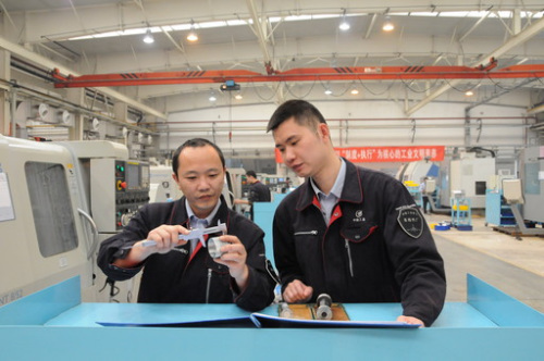 一季度,中航工业成飞潜心务实抓管理、激情拼搏促发展,各专业厂主动作为,自找压力,提升管理,零件生产接近60万件,实现了首季开门红,为二季度科研生产任务的完成奠定了坚实的基础。图为成飞劳模、系统件厂车工王永洪(左)与工友正在自检零件加工质量。(张小洪)