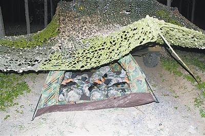 凌晨2时,笔者返回营地时,不料被一顶单兵帐篷挡住了去路。定睛一看,原来有战士在此宿营,不远处的凹地里还“潜伏”着一辆披着伪装网的战车。