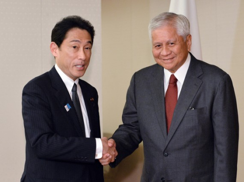 2013年5月22日,菲律宾外长德尔罗萨里奥(右)与日本外相岸田文雄在东京会晤。