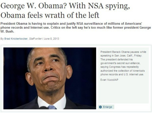 据美国《基督教科学箴言报》当地时间6月8日报道,美国国家安全局因为针对美国国内民众及国外民众的电话通信及社交媒体活动实施了大规模的监视被曝光而引来了广泛的非议,而美国总统奥巴马更是因此被指责太像自己的前任小布什。