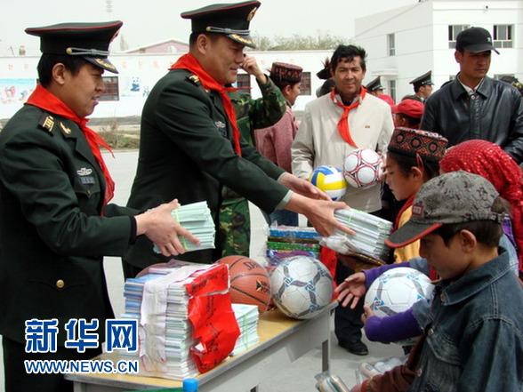 军爱民、民拥军,军民团结一家亲。作为团长,赵勇一直心系着驻地的少数民族学生图为团长赵勇在向驻地学生赠送文体用具。