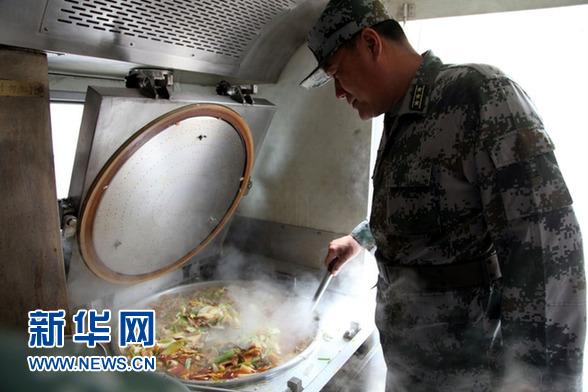 部队在野外驻训期间,赵团长十分关心连队战士的伙食质量是否会下降,训练间隙,他到炊事车上检查连队饭菜情况。