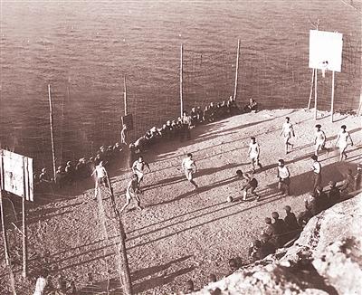 这张照片拍摄于1960年11月。照片上的篮球场位于黄海深处一个面积仅有0.03平方公里的小岛上,是在坚硬的岩石上开凿出来的。阳光下,球架的影子一直贯穿到球场的另一头。一张用铁丝和旧电缆编织成的大网,拦住临海的三面,防止篮球滚入大海。而这里的篮球更特殊,是用麻袋片把棉花包起来,再用绳子捆起来做成的。因为没有弹性,跳不高,所以不会轻易掉到海里去。