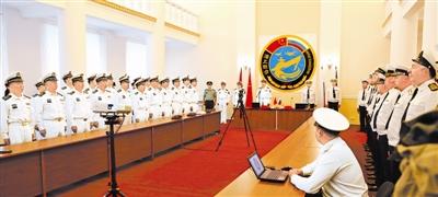 中俄双方在俄太平洋海军学院举行实兵演习开始仪式。