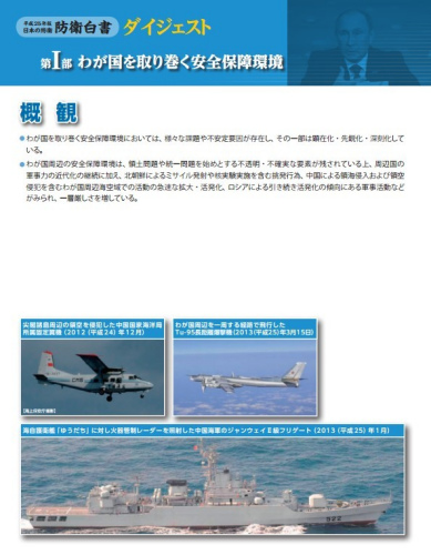 白皮书指出,“中国军机接近和侵犯日本领空的次数已经超过了俄罗斯,需要强化防空能力。同时要对进入日本领海与公海连接海域的外国潜艇加强监控”、“万一岛屿遭到外国军队的占领,必须动用战斗机和舰艇实施射击,在制压敌方后,由陆上自卫队实施登岛夺回作战”。