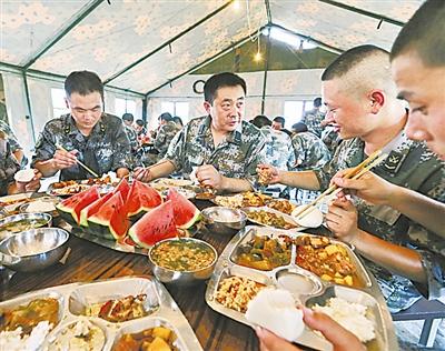 18时25分,倪先允(左二)和战士们一起在野战帐篷中吃晚餐。