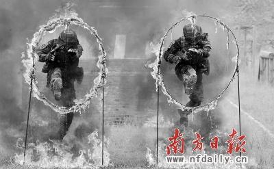 近日,武警广东总队二支队反劫机中队派出10名特战队员参加了武警部队年度反劫机干部骨干比武竞赛,一举摘下团体总分第一,并在11个科目中取得5个单项比赛的桂冠。图为爆炸冲击中,战士们正在攀爬高墙,穿越火障。