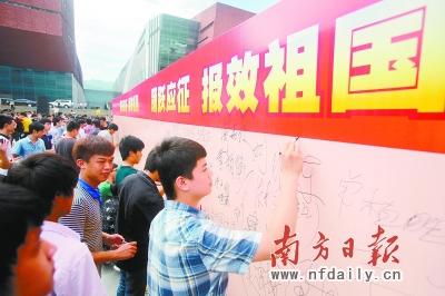 昨天,广东省征兵报名仪式上,适龄应征青年纷纷在报名台上写下自己的名字。记者 曾强 摄