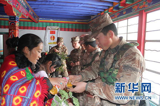 村民为巡逻归来的官兵敬上一杯甘甜的青稞酒