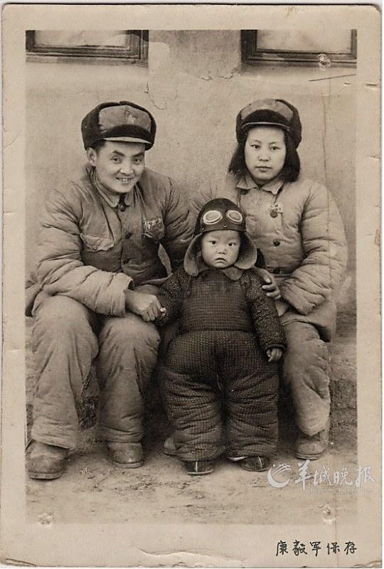 康致中(左一)出征前夜,和2岁的儿子康明、妻子的最后合影 康明供图