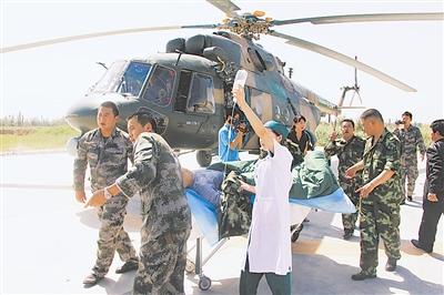 今年5月,天文点边防连指导员程彦胜突发高原脑水肿,生命垂危。新疆军区立即启动应急救援机制,某陆航旅迅速出动直升机第一时间将程彦胜转运至解放军第18医院救治。2011年10月,阿里军分区通信站战士赵轩突发脑出血病情危急,该旅一架直升机紧急起飞,及时将医疗专家送到阿里军分区,成功实施阿里地区首例开颅手术。近年来,该陆航旅在完成抢险救灾、国外救援等多样化任务的同时,还多次紧急出动转运地方各族群众,被誉为天山“吉祥鸟”。-陈睿、特约记者许必成报道
