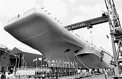 1999年印度议会批准了自造轻型航母“蓝天卫士”号的计划,2006年11月建造工作正式启动。虽说是印度国产航母,但“蓝天卫士”号由法国设计蓝图,搭载俄罗斯飞机,部分设计由意大利帮助完成。为纪念退役的“维克兰特”号,印度将“蓝天卫士”号重新命名为“维克兰特”号,并于2009年2月28日举行了龙骨安装仪式。2011年12月29日“维克兰特”号航母从科钦造船厂出坞“下水”。不过,此次下水是为了把船坞让给其他船舶的建造。今年8月12日,“维克兰特”号终于在落后原计划4年后正式下水,开始新一阶段建造工作。图四