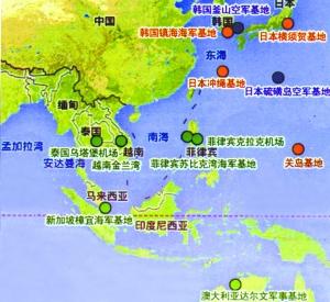 在韩国济州岛上,韩国军方正在为美国导弹防御系统修建军事基地,美军可定期使用该基地。2012年4月,美国海军陆战队进驻澳大利亚的达尔文港海军基地,并致力于在澳大利亚科科斯群岛上打造一个无人机训练基地。同年5月,美国海军在美属天宁岛上废弃的空军基地重新修葺了一条长约2400米的跑道,美军B-2轰炸机正式从这里起飞。此外,五角大楼还考虑未来在印尼、马来西亚和文莱建立小型军事基地,并继续推动与印度之间密切的军事合作。