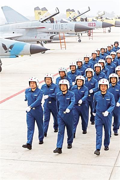 空军试飞员们迈着铿锵的步伐,受命出征。新华社发(谭超摄)