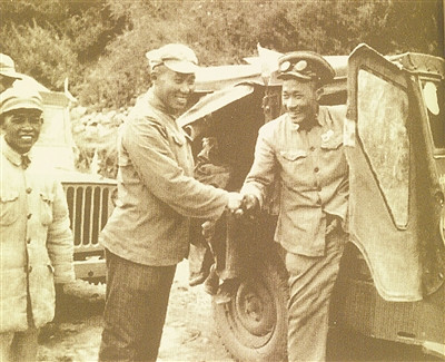 谭善和(中)在刚刚修通的康藏公路雅安至甘孜段,迎接18军军长张国华。张国华乘坐的这辆吉普车,也被谭善和临时借用,参加了在金沙江东岸的接力运粮行动。