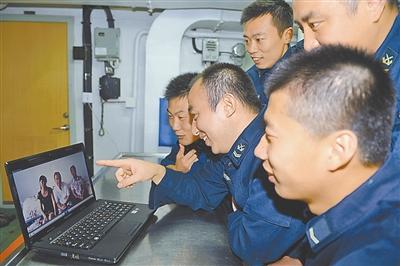 图:为激励官兵圆满完成护航及后续出访任务,第十四批护航编队邀请官兵家属录制亲情视频短片,传递“好声音”“正能量”。图为绵阳舰的战士围在一起观看亲情视频。秦川摄 -王长松、特约记者李丁报道