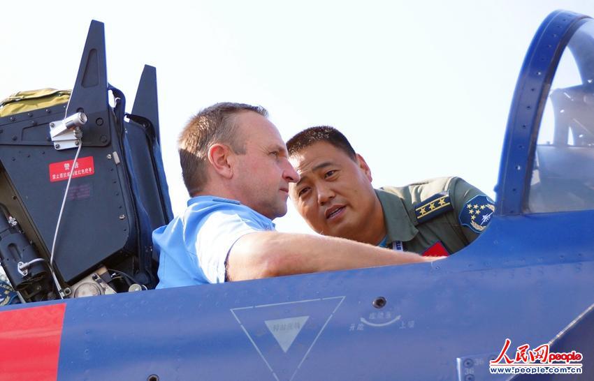 当地时间8月21日下午,俄罗斯空军副总司令兹维亚津(左),与中国空军八一飞行表演队队长曹振(右)探讨飞行体会,了解歼十表演机性能。申进科 摄