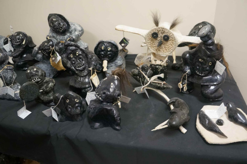 在约阿港因纽特艺术馆里展销的面貌奇绝的黑石雕刻作品。(新华社记者 张大成 摄影)