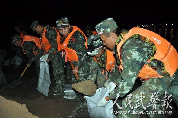 为保证夜晚填装沙袋速度,支队协调5台发电机组到抗洪一线,在防洪大堤上架起无数盏明灯,照亮抗洪生命线,全体参战干部身先士卒、率先垂范,既当指挥员、又当战斗员,党员突击队员坚持吃苦在前,冲锋在前,做到了“哪里有险情,哪里就有党员”,彰显了“一个党员就是一面旗帜”的风采。连续高强度的奋战,部分官兵手上脚上都磨出了水泡,仍坚持轻伤不下战线,官兵们深受感染,拼劲更足了,大堤上一排排白色屏障构成了一道独特风景线。