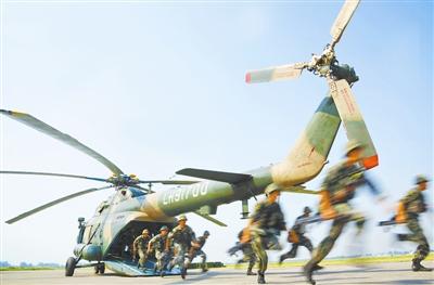 8月21日,济南军区某摩步团官兵与某陆航团进行协同训练。连日来,两支部队携手开展人员物资装卸载、空中远程机动、“敌”后渗透破袭、火力支援配合等实兵实装协同课目训练。图为官兵利用直升机实施机降,快速奔向战场