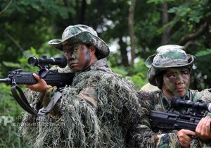 一天下午14时,狙击手集训队3人一组,正身披迷彩网,脸涂迷彩油,全副武装进行越障训练。