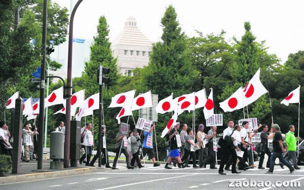11日,日本民族主义团体“加油日本”成员到国会大厦前游行,支持日本把钓鱼岛“国有化”的行动。(图片来源:路透社)