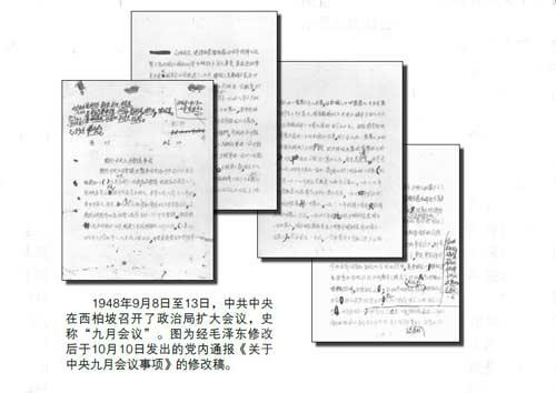 为适应革命战争形势的发展,确立新的战略任务,党中央和毛泽东于1948年9月8日至13日,在西柏坡召开了政治局扩大会议,史称“九月会议”。它是抗战胜利后召开的一次规模较大的重要的中央会议,也是自1947 年3 月中央撤离延安后的第一次政治局会议。