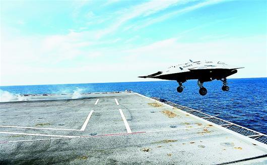图为:美国海军X-47B无人机从航空母舰上弹射起飞。(资料图片)