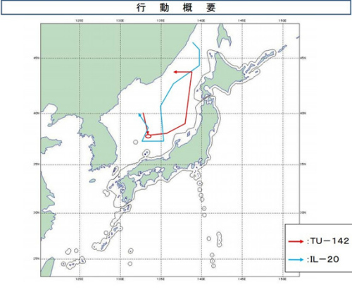 图为日防卫省公布的俄罗斯3架军机飞行线路示意图
